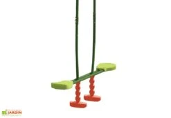 La balançoire face-à-face bénéficie d’assises confortables, de formes douces qui protègent lors des chocs et de tubes en acier galvanisé solides. Elle doit être placée à 30 cm de la structure du portique, à 45 cm de tout autres agrès et à 35 cm du sol.