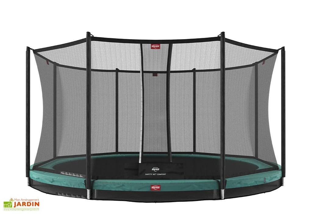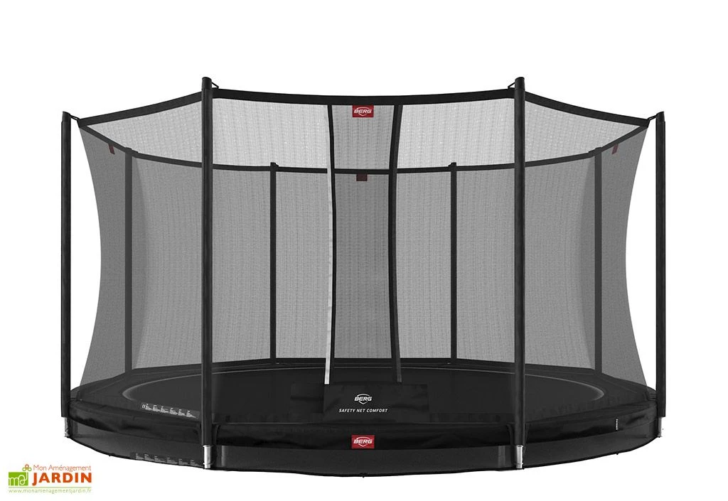 Le trampoline enterré de la marque Berg possède une structure en acier galvanisé de 430 cm de diamètre. Insensible à la rouille, même exposée aux intempéries, cette solide structure est bordée de rembourrages en mousse de 2 cm d’épaisseur. Un filet de protection est également inclus, pour plus de sécurité. Notez que ce trampoline est destiné aux enfants âgés d’au moins 6 ans.