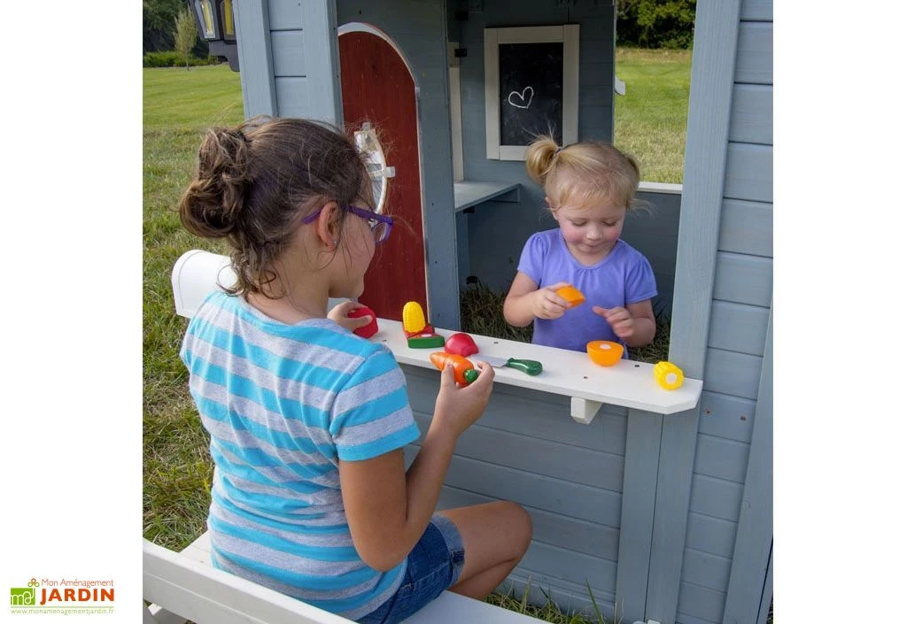 La maisonnette en bois est livrée en kit, facile à monter grâce à une notice de montage détaillée et à des panneaux déjà percés et pré-teints. Le temps est estimé à 3h à deux. Vous pouvez également appliquer une couche de vernis aqueux pour plus de protection. La garantie est de 2 ans.