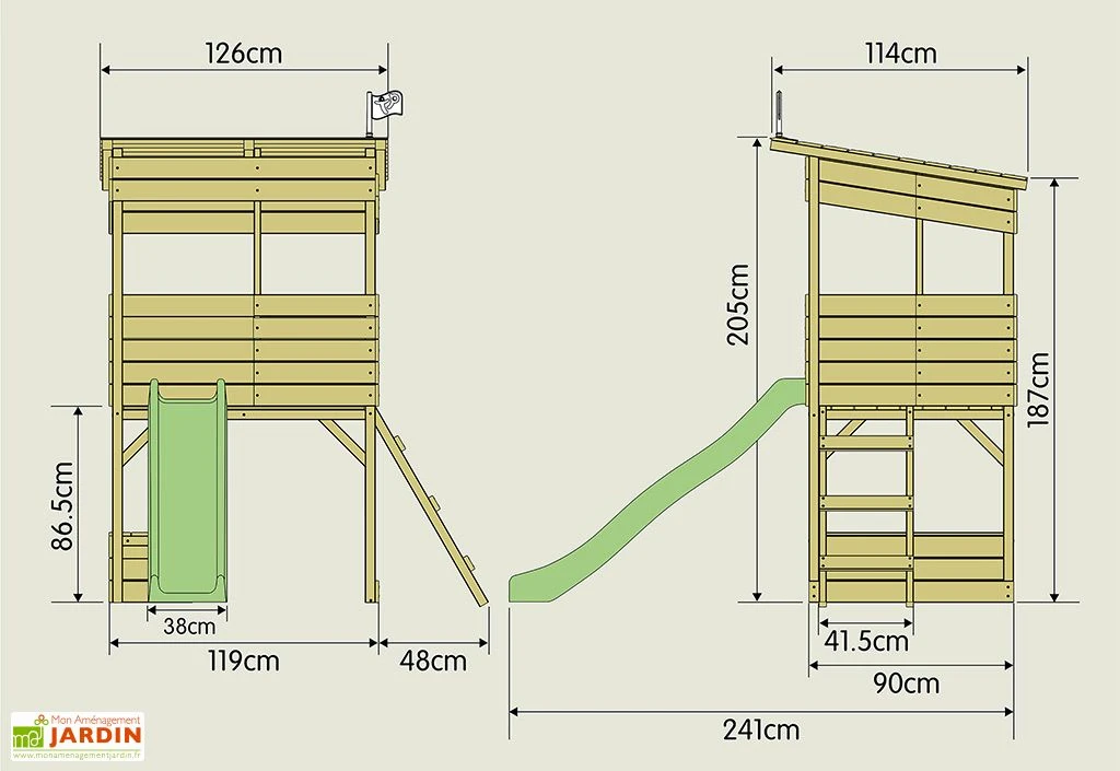 La petite aire de jeux mesure 2,41 m de longueur, 1,26 m de largeur et 2,05 m de hauteur.