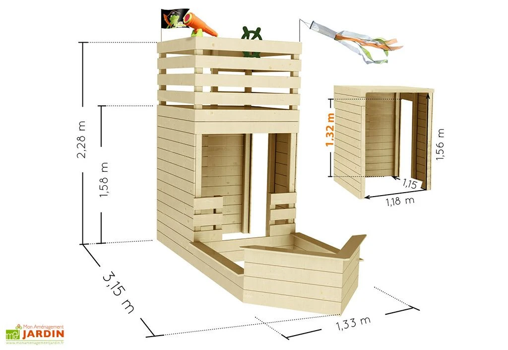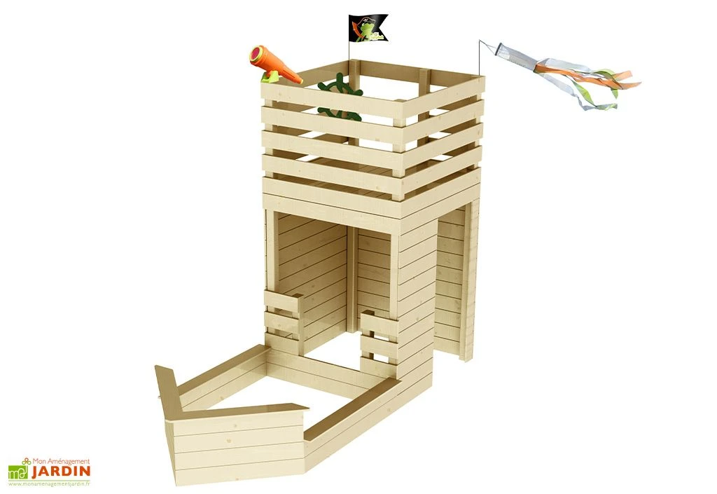 Cette cabane en bois Soulet aux allures de bateau pirate est en fait une petite aire de jeux qui comprend 3 espaces :