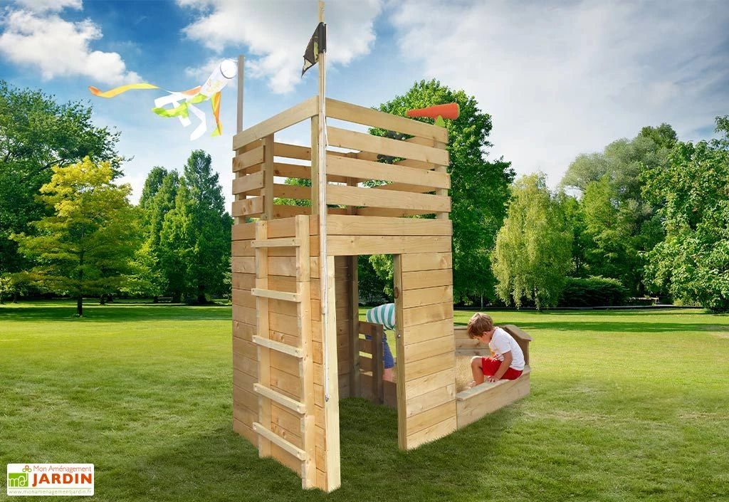 Cette maisonnette en bois est livrée en kit à monter soi-même à l’aide d’une notice détaillée. Le temps de montage est estimé à 4 heures à deux. Les pattes de scellement sont incluses, elles permettent de fixer la structure dans des plots en béton (non inclus). Les sacs de sable ne sont pas inclus. Vous pourrez remplir le bac avec 330 kg de sable maximum.