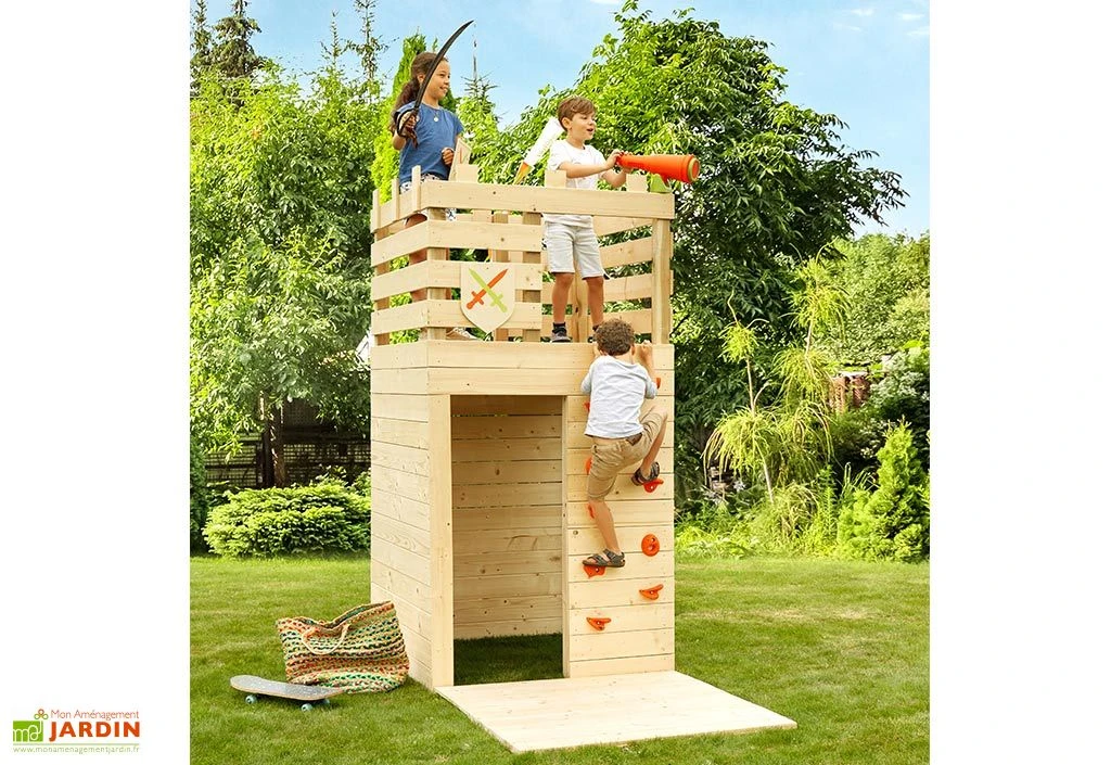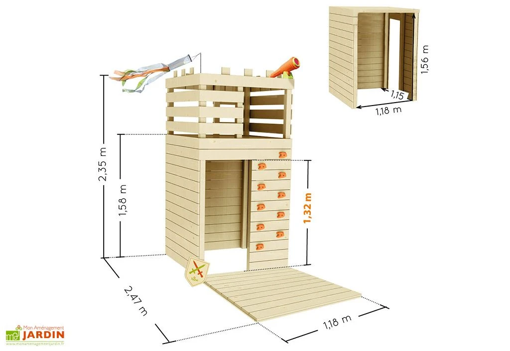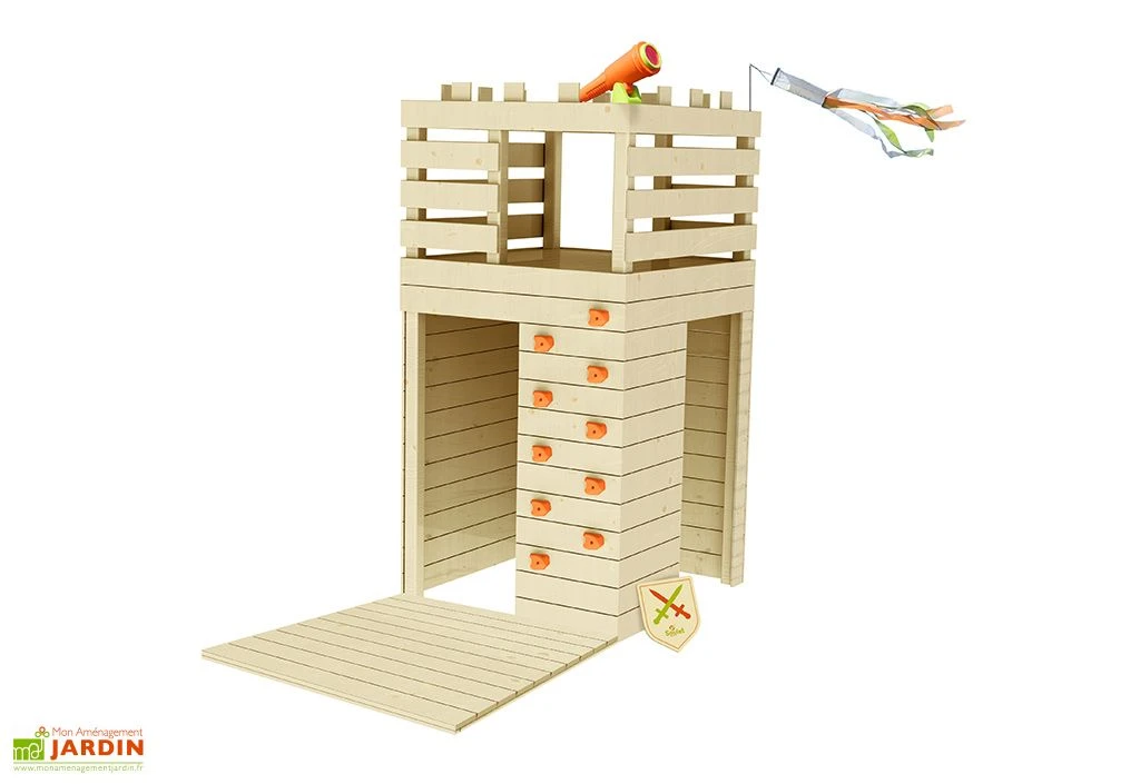 La cabane en bois Knight de chez Soulet est un petit château fort pour les enfants dès 3 ans. Elle comprend une maisonnette de 118 x 115 cm de côté et de 156 cm de hauteur sous une plateforme accessible via un mur d’escalade ou une échelle en bois. La maisonnette comprend également une petite terrasse à l’avant.