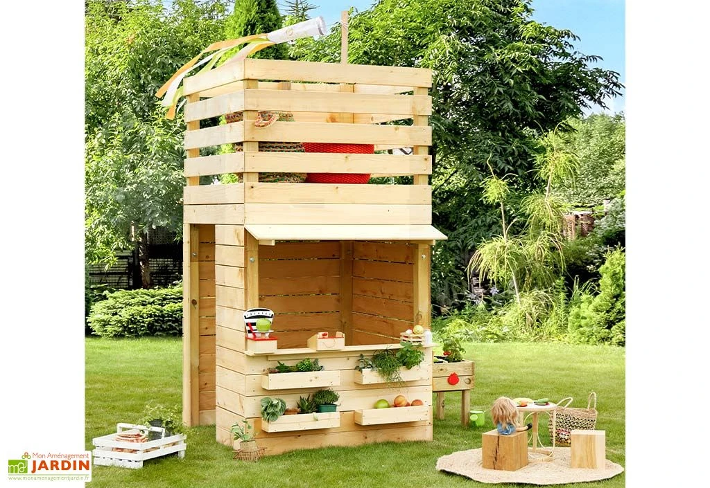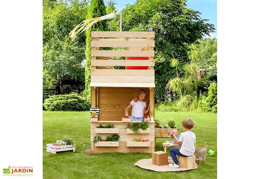 La maisonnette quant à elle mesure 1,18 m x 1,15 m de côté et 1,56 m de hauteur. Elle comprend 1 ouverture sans porte de 57 x 132 cm (l,h) et un comptoir avec des 4 bacs en bois pour jouer au marchand de fruits et légumes par exemple. Un tableau noir à craies permettra même à l’enfant de gérer sa petite boutique.