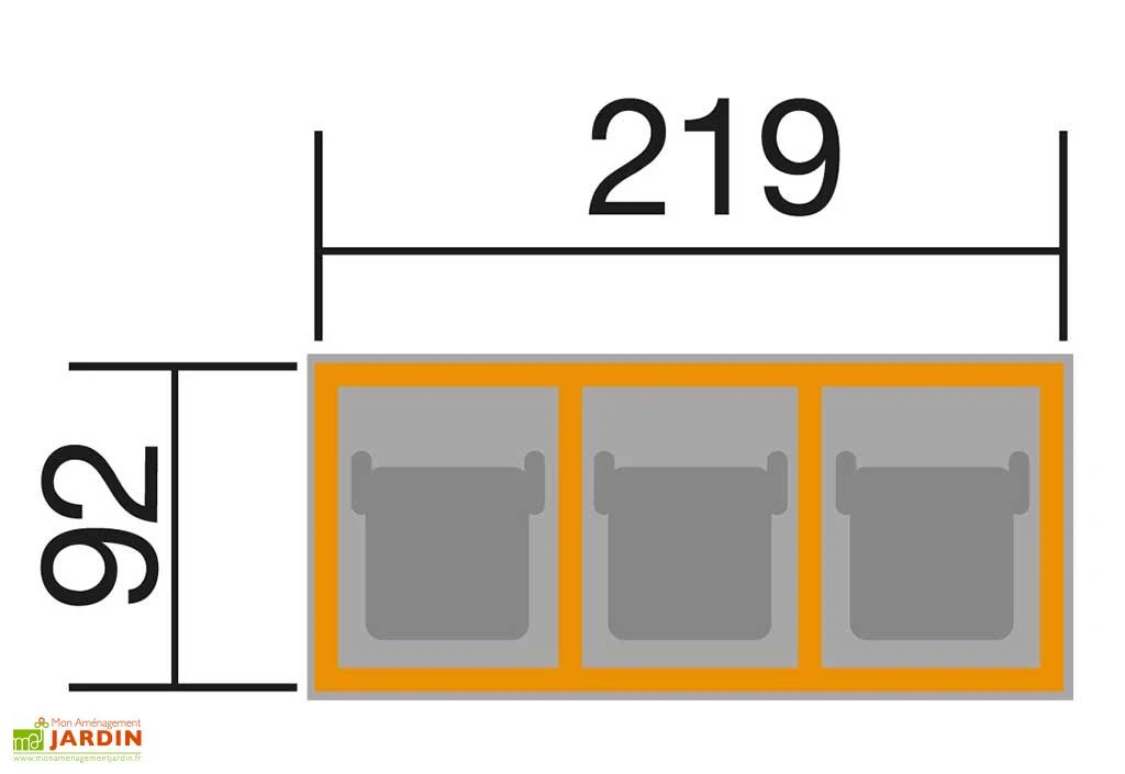 Ce grand cache-poubelle mesure 219 cm de long sur 92 cm de profondeur, pour 122 cm de haut. Très pratique, il dispose de portes frontales permettant de sortir vos conteneurs en toute simplicité. Il est également doté de couvercles avec chaînettes pour le remplissage des bennes. Notez enfin que ce cache-poubelles vous sera livré en kit et qu’il devra être monté et installé par vos soins (notice détaillée et accessoires de montage inclus).