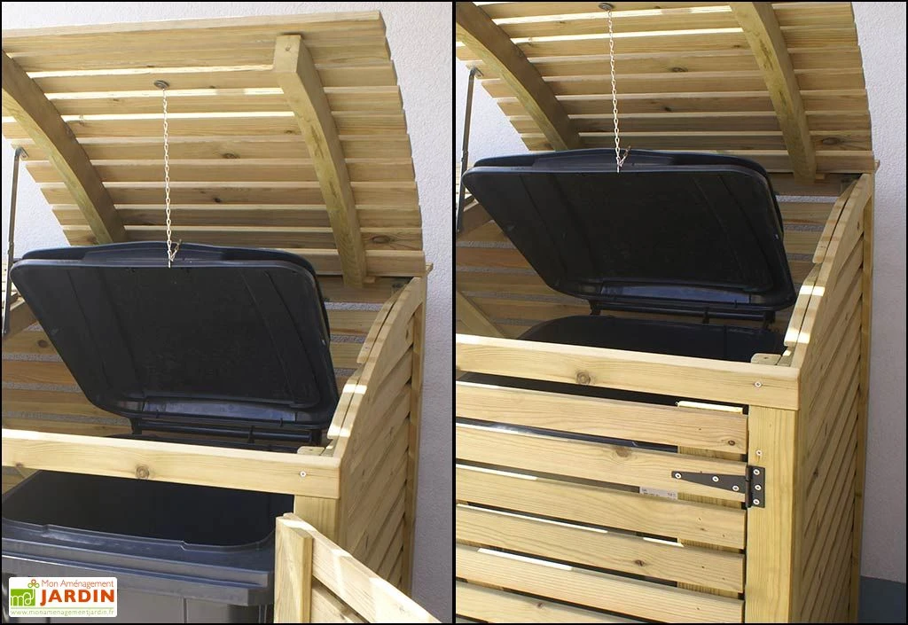 Le cache-poubelle simple de chez Gardival est constitué de planches en bois de 16 mm d’épaisseur et de 58 mm de hauteur. Il mesure 88 cm de profondeur, 75 cm de largeur et 137 cm de hauteur et permet d’abriter une poubelle. Le bois utilisé pour la confection de l’abri est du pin traité autoclave qui résiste parfaitement à la moisissure et aux insectes. Le cache-poubelle dispose d’un fond afin de cacher parfaitement vos poubelles ainsi que d’un couvercle avec compas d’arrêt.