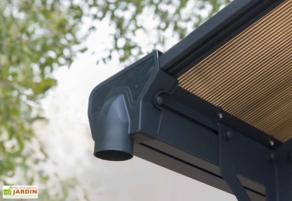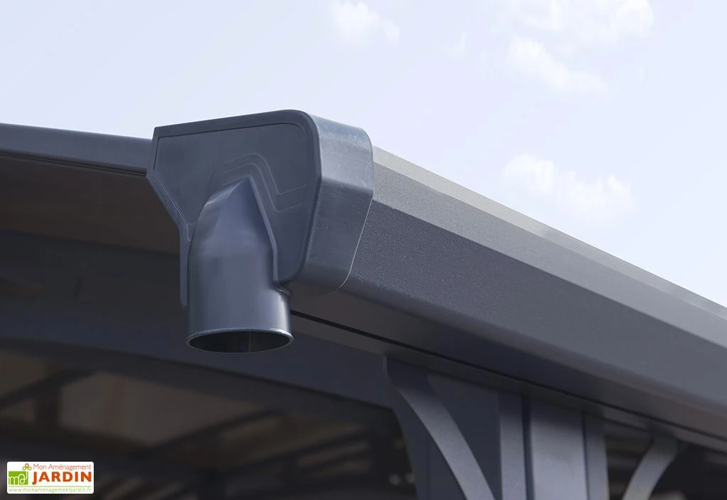 Fabriqué à partir de matériaux solides et résistants aux intempéries, ce carport en aluminium est pensé pour résister à des vents pouvant atteindre les 120 km/h. Sa couverture est conçue pour supporter une charge maximale de 150 kg/m², en cas de chute de neige par exemple. L’eau de pluie se verra évacuée ou collectée, au choix, grâce aux gouttières avec système de récupération d’eau également présentes.