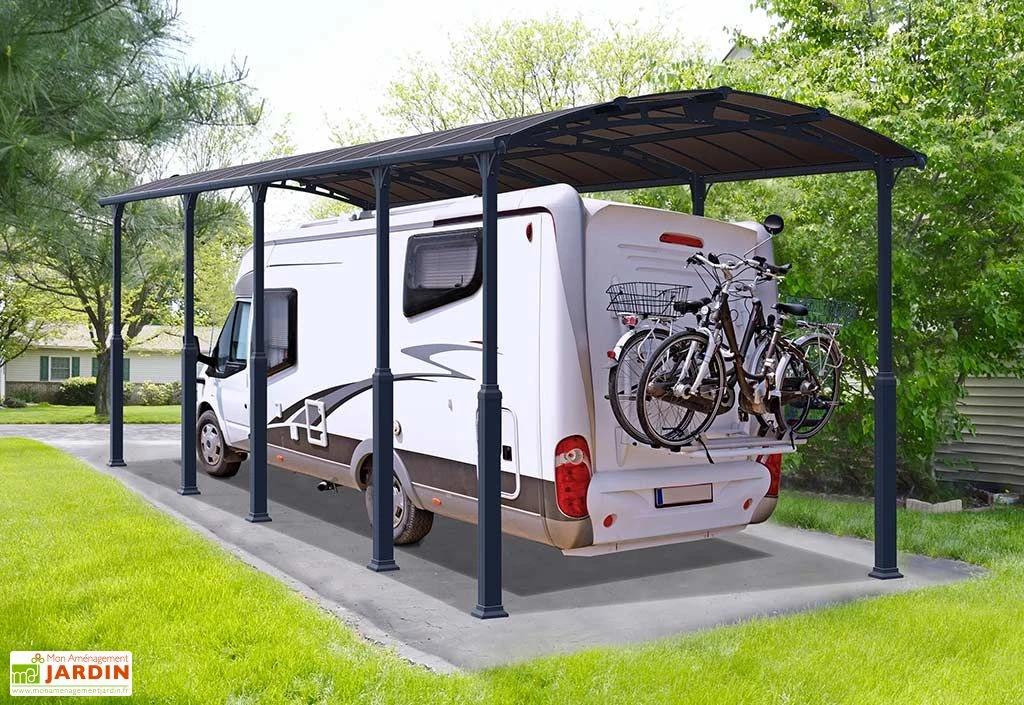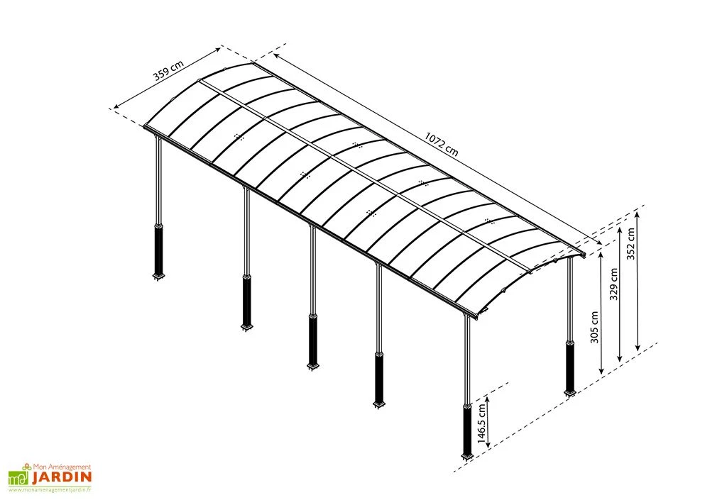 Livré en kit, ce grand carport devra être monté et installé par vos soins. Sa solide structure en aluminium gris anthracite RAL 7016 dispose de raccords en acier galvanisé et accueille une couverture composée de panneaux en polycarbonate semi-transparent de 6 mm d’épaisseur. Ces panneaux sont conçus pour filtrer 100% des rayons UV, le tout sans jamais jaunir ou décolorer.
