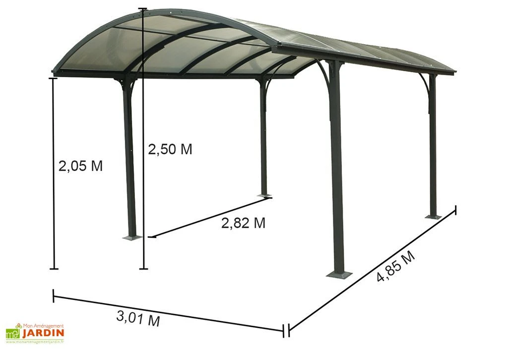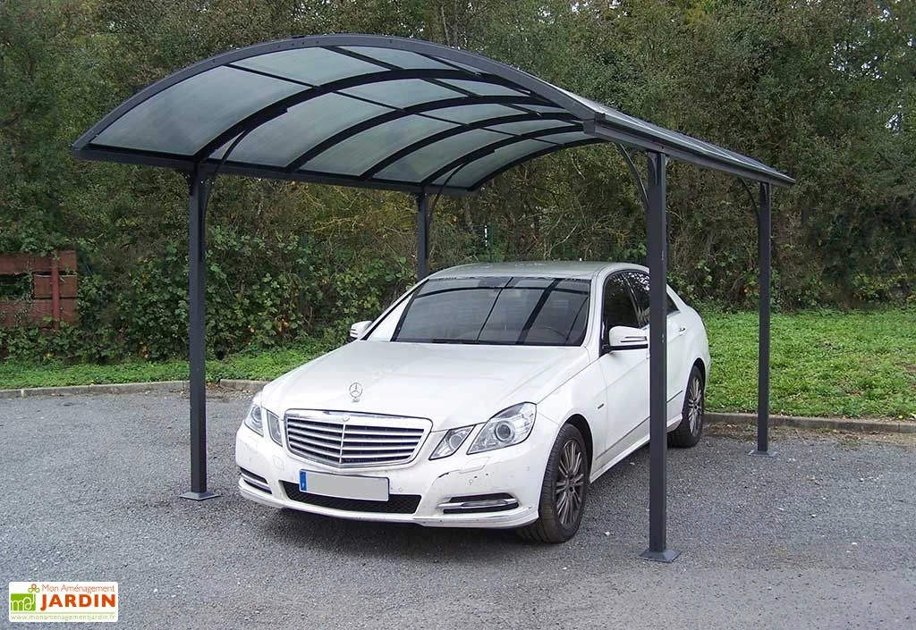 La toiture translucide foncée du carport est arrondie. Elle est composée de 10 plaques de polycarbonate de 6 mm d’épaisseur dernière génération, qui laisse passer la lumière tout en réduisant la chaleur et les UV. Le carport permet de protéger votre voiture ou vos motos des UV et des intempéries. Ce carport n’est pas adapté pour une altitude de plus de 500 m et nécessite d’être déneigé régulièrement en cas de chute de neige supérieure à 10 cm. La toiture est équipée de gouttières latérales. Une bâche de protection pour carport est disponible dans la rubrique « Accessoires ».