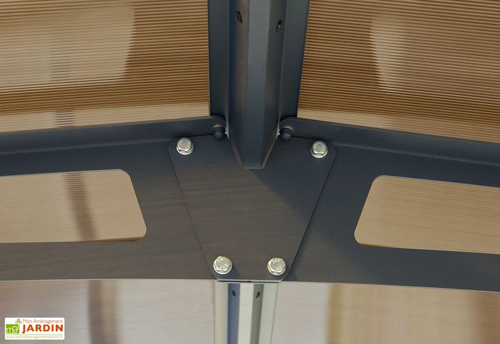 Cette couverture repose sur une solide structure en aluminium gris anthracite RAL 7016 (dont l’épaisseur est de 2 mm au niveau des poteaux) avec connexions en acier galvanisé. Ces matériaux, tout comme le polycarbonate, sont insensibles à la corrosion et ne demandent aucun entretien particulier. L’ensemble est par ailleurs conçu pour affronter des vents violents, pouvant atteindre les 120 km/h. Un système de gouttière est également fourni, permettant non seulement d’évacuer l’eau de pluie, mais aussi de la collecter.
