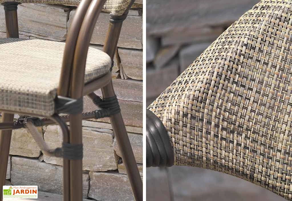Ce fauteuil de jardin empilable se compose d’une armature en aluminium et d’une assise en textilène couleur lin. Le textilène possède une très bonne résistance au soleil grâce à un traitement de protection contre les UV. Les assises sont également traitées pour résister à l’humidité et aux moisissures.