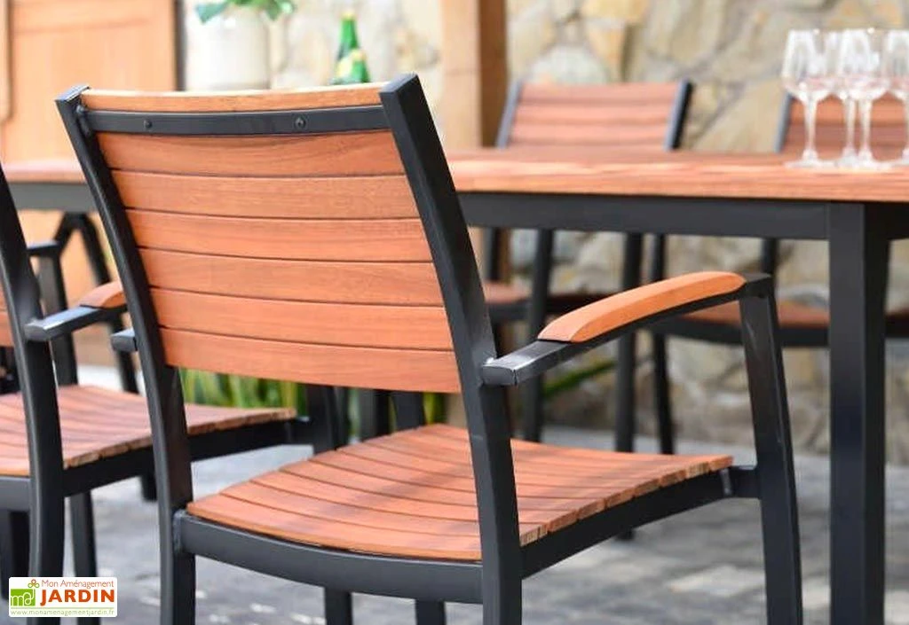 Cette chaise d’extérieur est dotée d’une assise, d’un dossier et d’accoudoirs fabriqués en eucalyptus, un bois très résistant, notamment en cas d’intempéries, et qui ne craindra ni l’humidité ni les attaques d’insectes et ce, sans demander d’entretien particulier. Notez que le bois utilisé est certifié FSC, ce qui signifie qu’il a été prélevé dans des forêts gérées dans le respect de l’environnement.