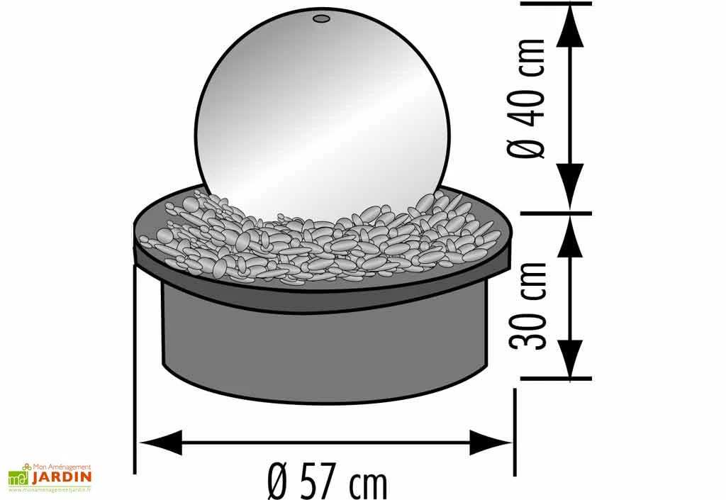 La fontaine est équipée d’une pompe à débit variable pour réguler le jet d’eau à votre convenance + un câble de 10 m pour le branchement électrique. Le socle, en plastique, dispose d’un diamètre de 57 cm. Le diamètre de la boule est de 40 cm. Un éclairage LED permet d’éclairer votre fontaine dans la nuit.