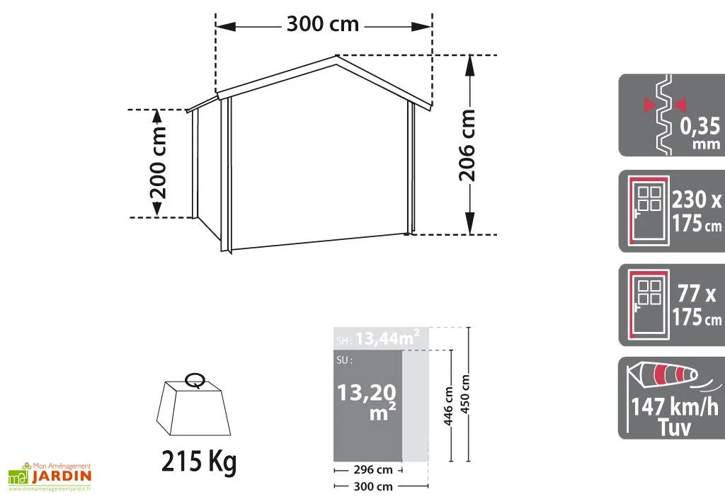 Le garage dispose d’une double porte articulée et sécurisée de 2,30 x 1,75 m (l,h). La résistance au vent est certifiée TUV jusqu’à 147 km/h. Vous avez la possibilité de peindre l’abri Zincalume avec une peinture métal couleur classique. Le garage est livré avec une porte latérale de 0,77 x 1,75 m(l,h). Il est facile à monter grâce à sa notice d’installation détaillée et le Concept EZISTOR : 80% de temps de montage en moins et 80% de vis en moins.