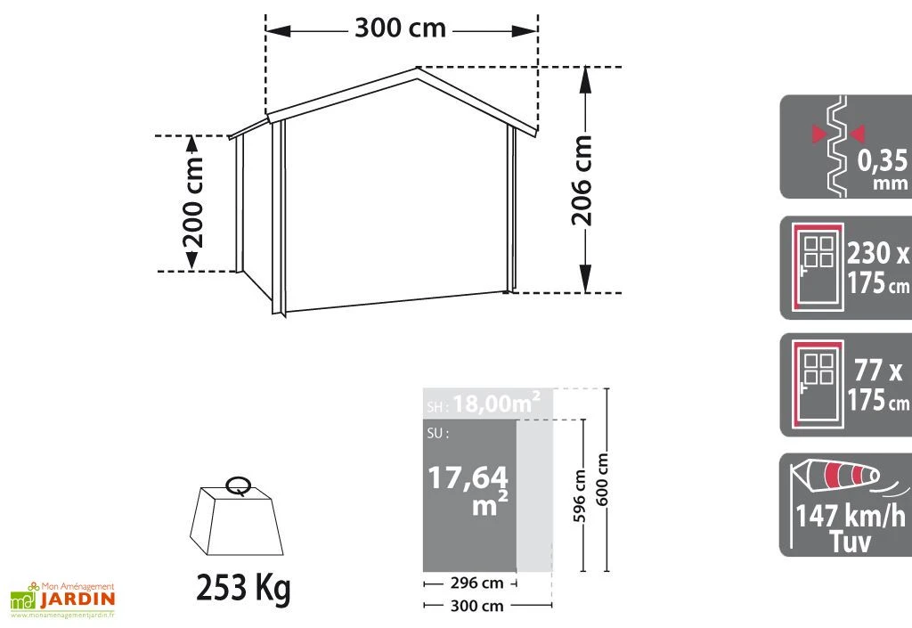 Le garage en métal gris de chez Forest Style dispose d’une garantie anti-corrosion de 20 ans. Il mesure 5,96 m de longueur, 3,00 m de largeur et 2,06 m de hauteur. Les panneaux en acier d’une épaisseur de 0,35 mm ont une protection Zincalume 2 fois plus résistante qu’une galvanisation à chaud.