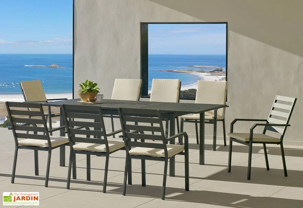La salon de jardin en aluminium gris anthracite de chez Hevea permet d’accueillir jusqu’à 8 personnes. Sa table est équipée d’une rallonge et peut passer d’une longueur de 170 cm de à 220 cm. Elle mesure 80 cm de haut pour 100 cm de large.