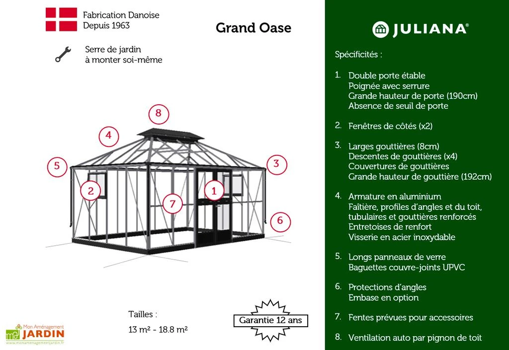 Le jardin d’hiver Juliana Grand Oase offre 13 m² de surface vous permettant d’installer un salon de jardin, d’en faire une salle de repos, un atelier de peinture ou de vous en servir comme serre de jardin. Il comprend une structure en aluminium, recouverte d’une peinture appliquée par poudrage. La peinture est gris anthracite et noire, pour offrir un look contemporain à l’ensemble. Les panneaux de côté et de toit sont en verre trempé de 3 mm d’épaisseur.