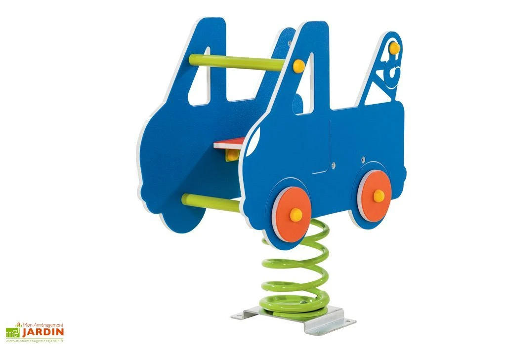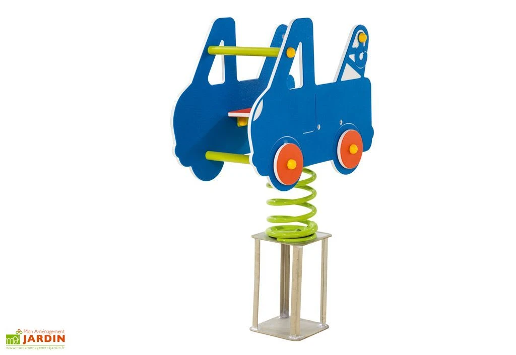 Votre jeu sur ressort Dépanneuse de chez KBT offre un design original et unique. Conforme à la norme TUV, votre jeu d’extérieur peut être installé et utilisé dans les lieux publics et les collectivités. il est en plastique PEHD 19 mm et anti-vandalisme. Ses poignées et ses cale-pieds sont en métal. Le ressort très résistant mesure 20 cm de diamètre pour 20 mm de section. Votre jeu à bascule peut être livré avec un ancrage à sceller ou à visser, au choix dans vos options. Ses dimensions sont de 0,74 x 0,86 m (l,h).