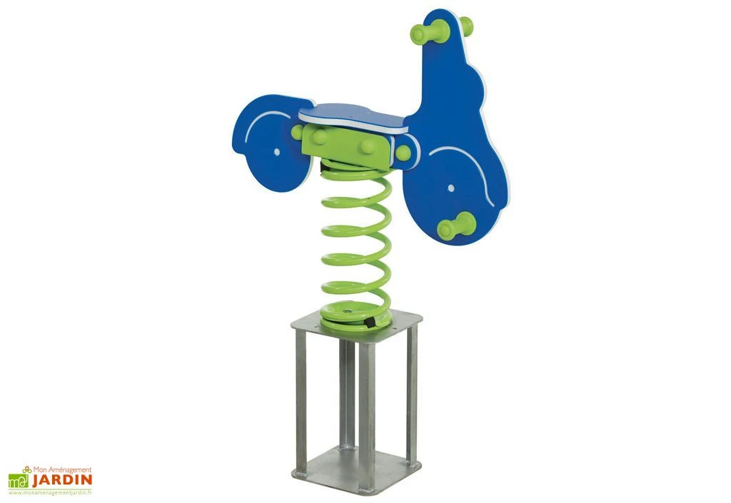 Votre jeu sur ressort Scooter de chez KBT est adaptĂ© Ă un usage privĂ© ou pour les collectivitĂ©s et les lieux publics grâce Ă sa certification TUV. En plastique massif PEHD 19 mm, votre jeu d’extĂ©rieur propose un design unique et apprĂ©ciĂ© des plus petits. Votre jeu Scooter est anti-vandalisme et vous offre une très grande rĂ©sistance. Le ressort de 17 cm de diamètre possède une section de 18 mm, qui lui confère une grande soliditĂ©. Les poignĂ©es et supports pour les pieds sont en plastique anti-dĂ©rapant. Vous pouvez choisir entre un ancrage scellĂ© ou un ancrage vissĂ© dans les options du produit.