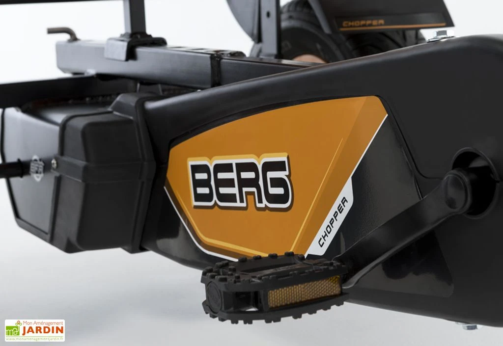 Le kart à pédales Chopper de chez Berg est doté de trois roues et d’une longue fourche, comme celle que l’on retrouve sur les véritables choppers américains. Il est équipé d’un système de rétrofreinage et de roue libre, ce qui signifie que le freinage s’effectue avec les pédales et que ces dernières ne tournent pas lorsque les roues sont en mouvement. Ce système permet même de repartir directement en marche arrière après l’arrêt. Notez que le Chopper dispose également d’un frein à main.