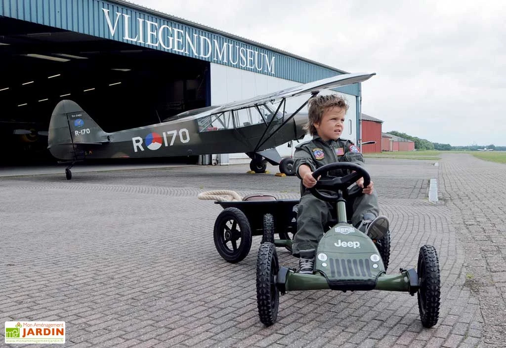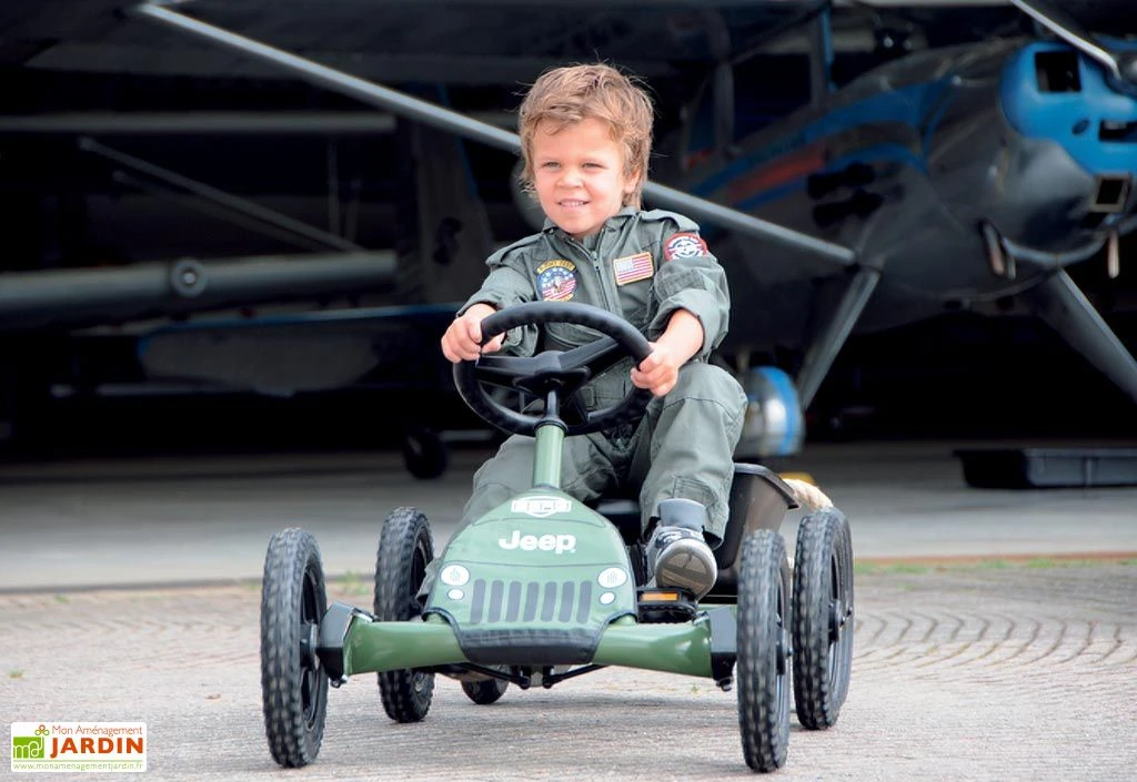 Votre kart à pédales Jeep Junior de chez Berg est idéal pour les enfants de 3 à 8 ans grâce à son volant et son siège réglables. Le kart jeep est de coloris vert et permettra à vos enfants de jouer aux militaires ou aventuriers grâce à son design original. La conduite en marche avant et marche arrière est possible grâce à son moyeu BFR. Le moyeu est le centre de la roue. La roue libre permet le freinage qui se fait en rétropédalage. L’axe basculant et la roue libre permettent une stabilité et une sécurité optimales. Les roues à 12 roulements à billes disposent de véritables pneus ce qui rend le kart très maniable et rapide. Compact et très léger, vous pourrez le ranger aisément, il peut tenir de façon verticale dans votre garage. La garantie est de 2 ans.