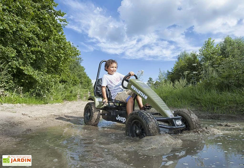 Le kart à pédales Jeep Revolution de chez Berg est à la fois robuste et maniable. Conçu pour s’attaquer à n’importe quelle surface, il possède de véritables pneus à air, tout-terrain, ainsi qu’un essieu oscillant pensé pour compenser les imperfections du sol, qu’il s’agisse de terre, de graviers ou de sable.
