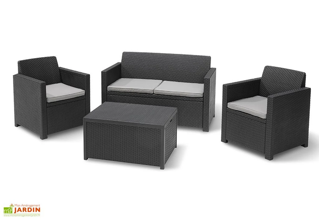 Ce salon de jardin de la marque Keter vous promet de passer de délicieux moments dans votre jardin ou sur votre terrasse. Composé d’un canapé de jardin, de deux fauteuils et d’une table basse, cet ensemble de mobilier de jardin peut accueillir jusqu’à 4 personnes. Sa table de jardin peut également servir de coffre de jardin, ce qui est très utile pour y ranger les coussins en cas de pluie.