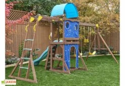 Cette aire de jeux de jardin est fabriquée en bois teinté à l’aide d’une solution à base d’eau qui ne représente aucun danger pour la santé des enfants. Elle se montrera solide et résistera à toutes les aventures de vos enfants, et ce pendant de nombreuses années ! L’ensemble de l’aire mesure 539,9 cm de large sur 248,3 cm de profondeur, ce qui signifie que ces jeux de jardin occuperont une surface de 13,3 m² dans votre extérieur.