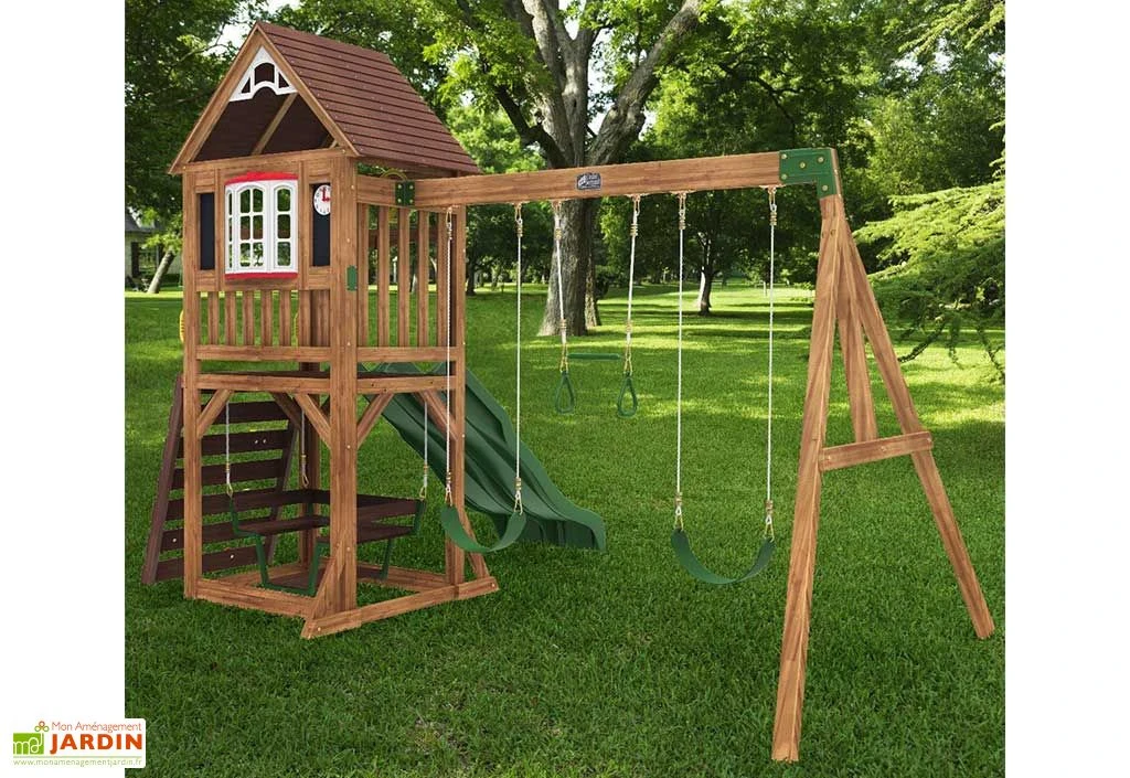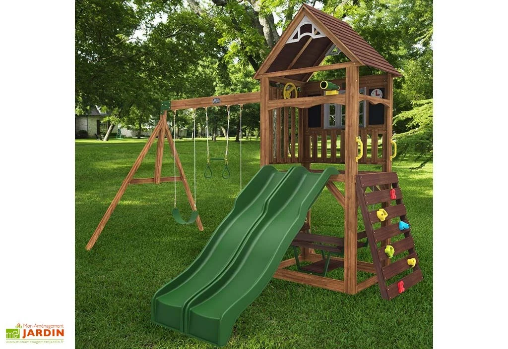 Pensée pour les enfants dès 3 ans, cette aire de jeux en bois est composée d’une maisonnette sur pilotis qui dessert un double toboggan et d’un portique équipé de deux balançoires et d’un trapèze. Une balancelle, située sous la plateforme, et un muret d’escalade complètent le tout. Les enfants pourront également retrouver, à l’intérieur de la cabane, un volant, une longue-vue et deux tableaux à craie, dont un avec horloge.