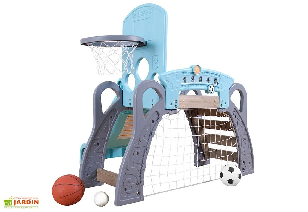 Un ballon de foot, un ballon de basket et une balle de baseball sont inclus avec cette aire de jeux multisports.
