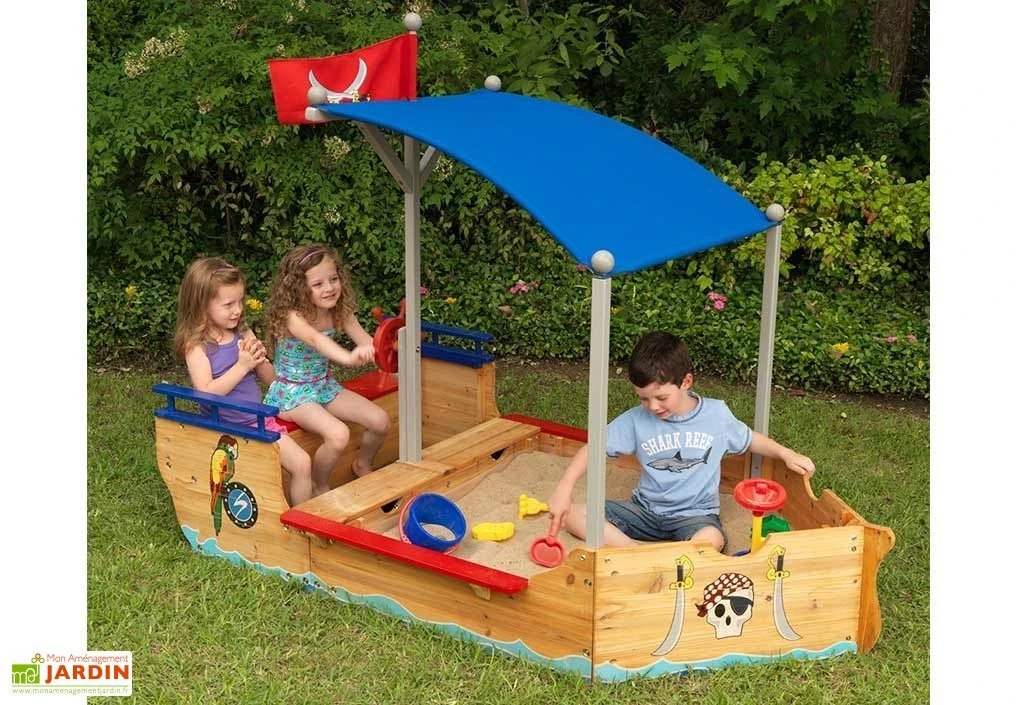 Original, ce bac à sable dispose également de décorations sur le thème de la piraterie. Une bâche en plastique, incluse, est placée sous le sable. Le bac à sable est livré en kit. Il se monte en 1h30 à 2h à deux personnes. Seuls un tournevis et des pinces sont nécessaires.
