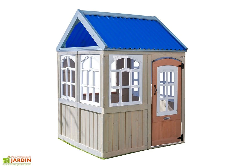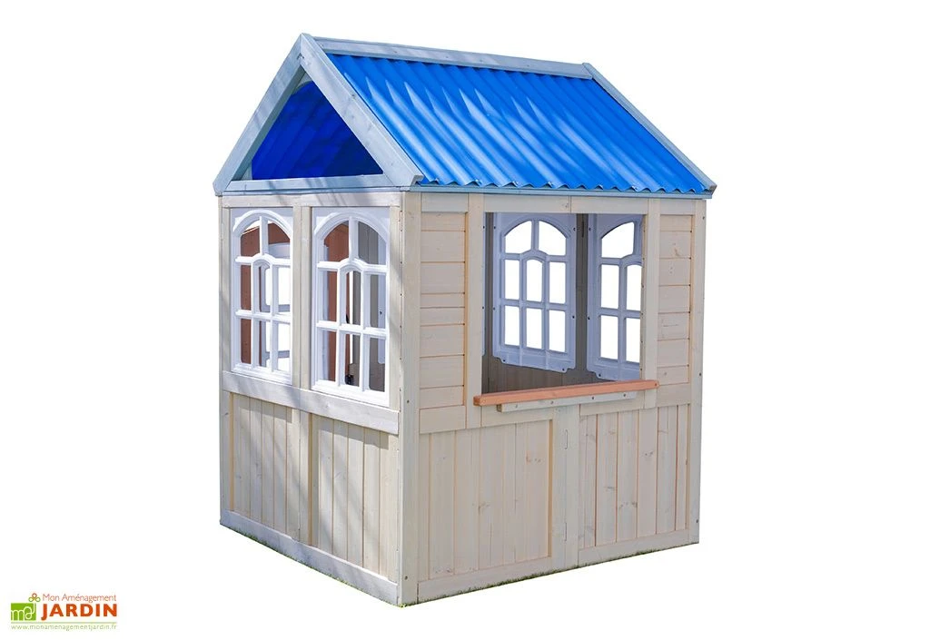 La cabane en bois bénéficie d’une porte qui se ferme avec un système d’aimant, de 5 fenêtres à carreaux et d’une grande fenêtre latérale ouverte. Ses couleurs vives et son grand espace permettent aux enfants de laisser aller leur imagination.