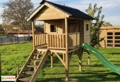 La cabane pour enfant est montée sur pilotis avec une hauteur de plancher de 1,18 m. Vos enfants pourront y accéder via un escalier et en redescendre grâce à un toboggan en PEHD de 230 cm de long. De l’autre côté de la cabane se trouve un portique avec deux balançoires également en PEHD, la hauteur totale du portique est de 2,21 m pour une largeur de 2,38 m et une profondeur totale de 2,596 m. Chaque agrès peut supporter un poids de 50 kilos, la structure complète pourra contenir 3 à 4 enfants de 3 à 12 ans pour un poids total de 100 kilos maximum.