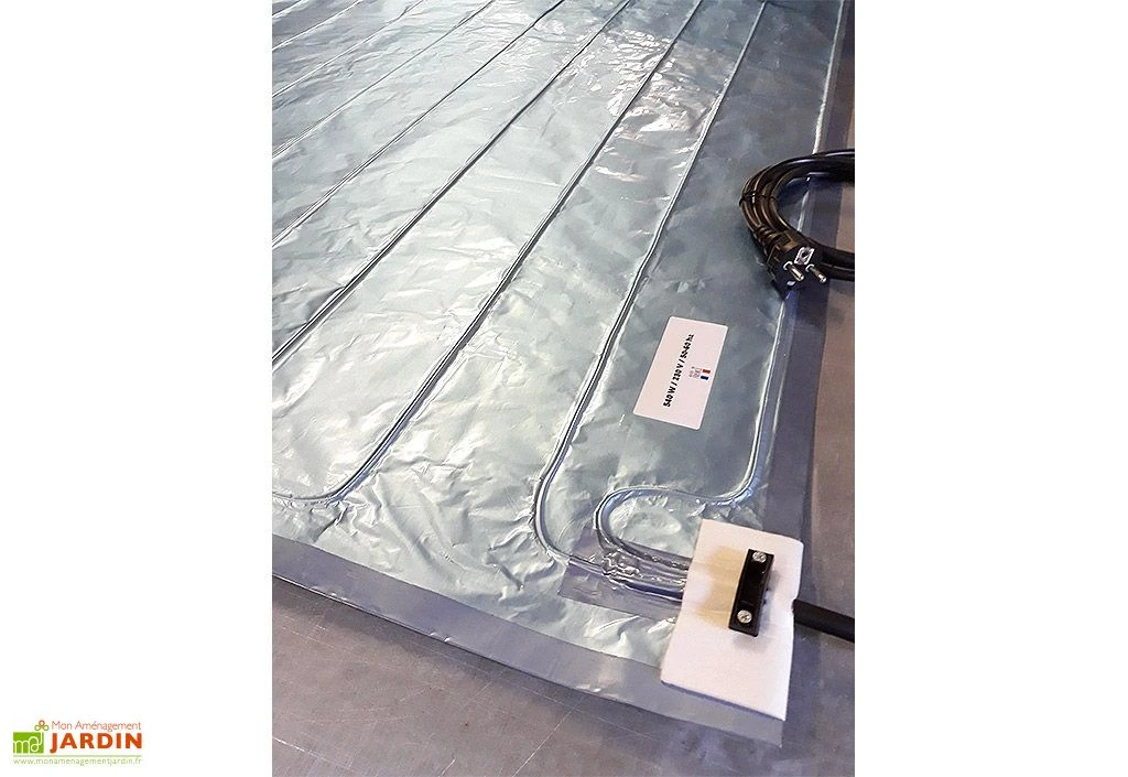 Conçue à partir de feuilles d’aluminium revêtues de polyester et dans lesquelles est enveloppé un fil résistif isolé grâce à du silicone, cette nappe chauffante offre jusqu’à 10°C supplémentaires. Il suffit pour cela de l’alimenter en électricité à l’aide du câble fourni. Une fois branché, le système libèrera une puissance comprise entre 150 et 170 W/m² pour une tension de 230 V.