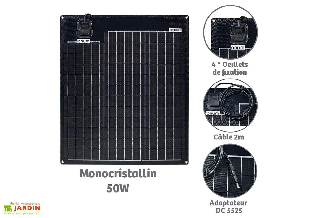 Ce panneau solaire signé Orium permet de délivrer une puissance de 50 Watts et une tension de 19 V pour recharger votre batterie autonome. Il est compatible avec les modèles Izywatt 150, Izywatt 250 et Izywatt 288 d’Orium. (Il est nécessaire de disposer d’un adaptateur non inclus pour le modèle 288.)