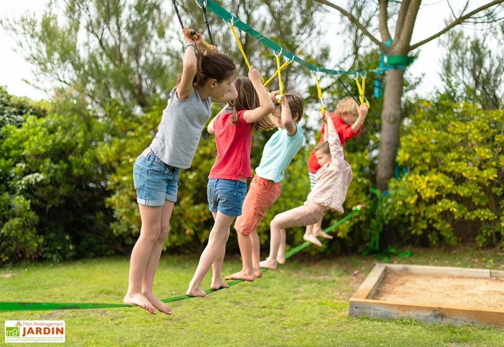 Ce parcours d’obstacles France Trampoline permettra à vos enfants de s’amuser tout en développant leur motricité. Pensé pour être installé entre deux arbres, il consiste en une slackline accompagnée de divers éléments auxquels vos enfants devront s’accrocher, l’idée étant de franchir les différents obstacles afin de terminer le parcours.