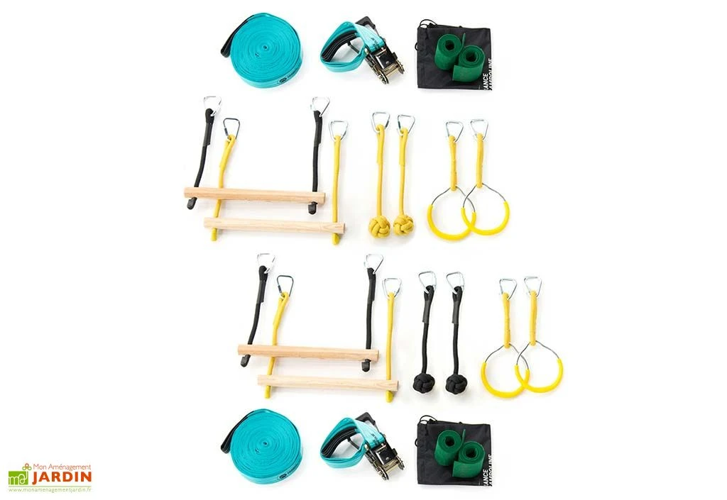 Pensé pour être installé entre deux arbres ou poteaux solidement ancrés dans le sol, ce parcours ninja pour enfant pourra être adapté à la configuration de votre terrain. La tension de la slackline pourra être réglée afin de rendre le parcours plus ou moins facile à parcourir (plus elle est tendue, plus il est facile de garder l’équilibre et d’avancer) et l’espacement des obstacles pourra également être modifié pour corser un peu le tout !