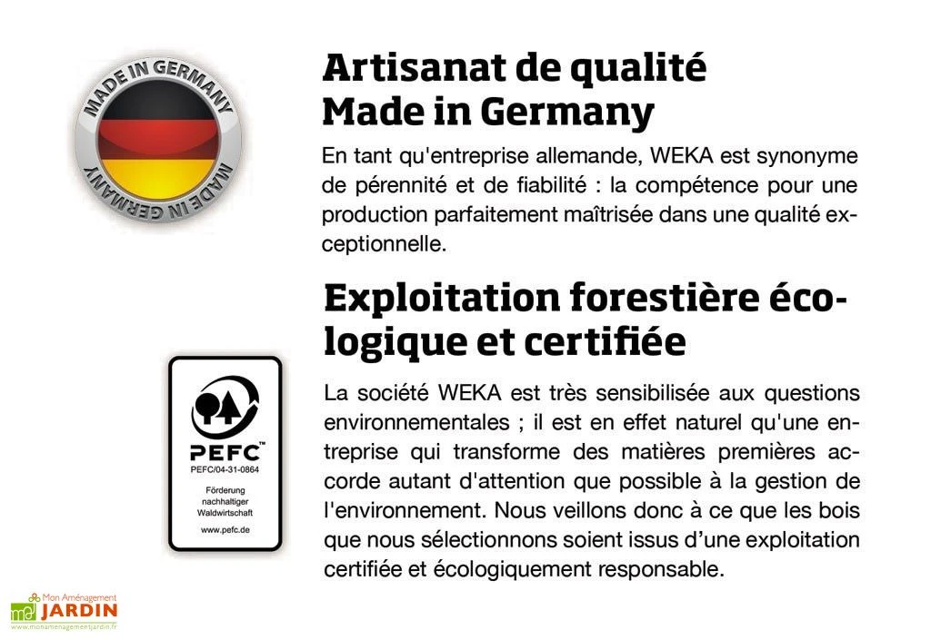Votre carport de chez Weka est en bois FSC traité autoclave. Le bois utilisé pour la confection du carport est du pin polonais. Le carport possède un toit en plastique résistant à un poids de 125kg/m² de neige.