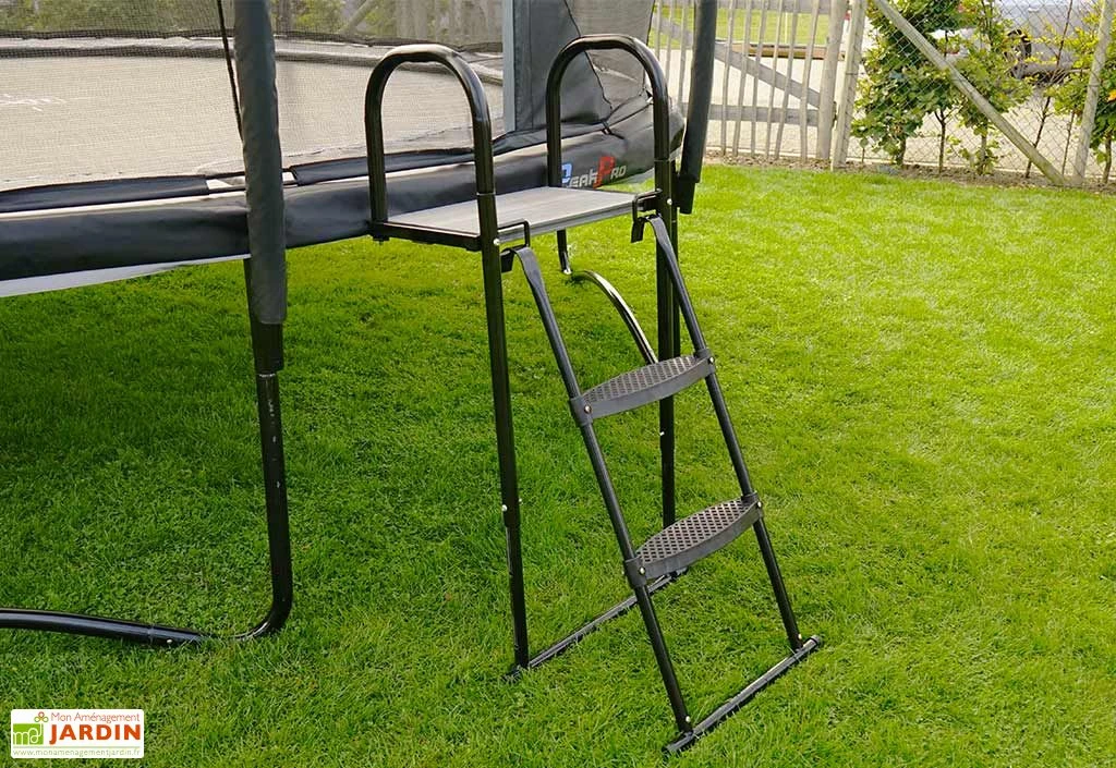 Dans un souci d’adaptabilité, cette plateforme pourra être réglée en hauteur selon quatre positions. Vous pourrez donc l’utiliser avec n’importe quel trampoline sur pieds. Notez que cette plateforme est conçue pour supporter un poids maximum de 130 kg.