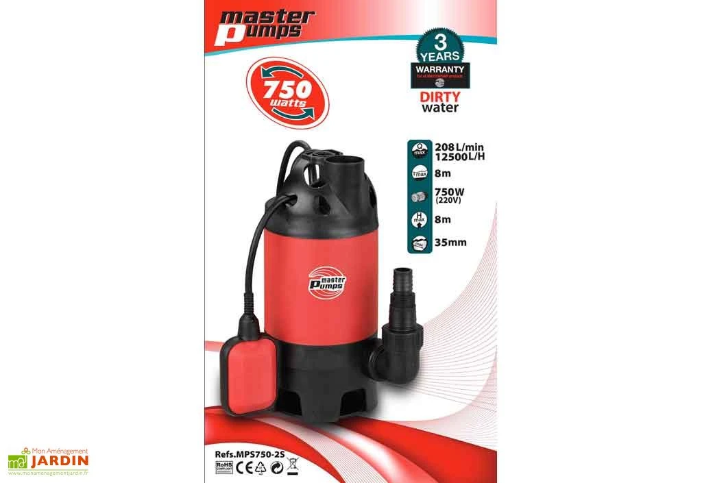 Votre pompe vide caves Submersible pour eaux chargées de chez Master Pumps dispose d’une puissance de 750 w avec un débit de 12500 l/h. La hauteur de refoulement maximum de la pompe est de 8 mCE, la profondeur d’immersion maximum est de 8 m. La granulométrie maximum accepté par la pompe et de 35 mm. La pompe est équipée d’une turbine PPO, de garnitures mécanique, d’un câble d’une longueur de 10 m et d’un flotteur pour assécher les sols jusque quelques mm d’eau résiduel. Cette pompe à eaux chargées dispose de 2 sorties horizontale et verticale pour une utilisation optimale suivant le travail de pompage à effectuer. La pompe est conforme aux normes CE avec une garantie 3 ans.