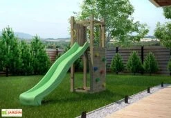 Votre portique Zébulon de chez Chalet-Jardin possède un mur d’escalade avec 6 rochers, une échelle d’accès pour aller à la plateforme qui mène au toboggan de 2,26 m et de coloris vert clair.