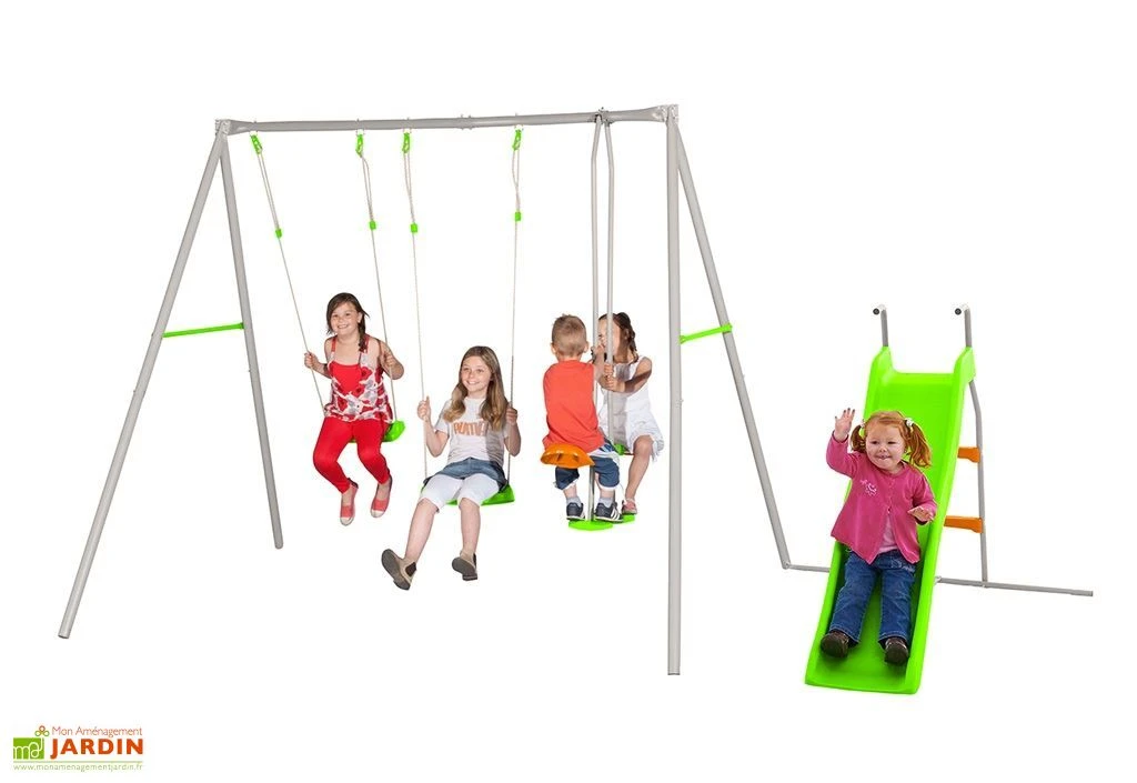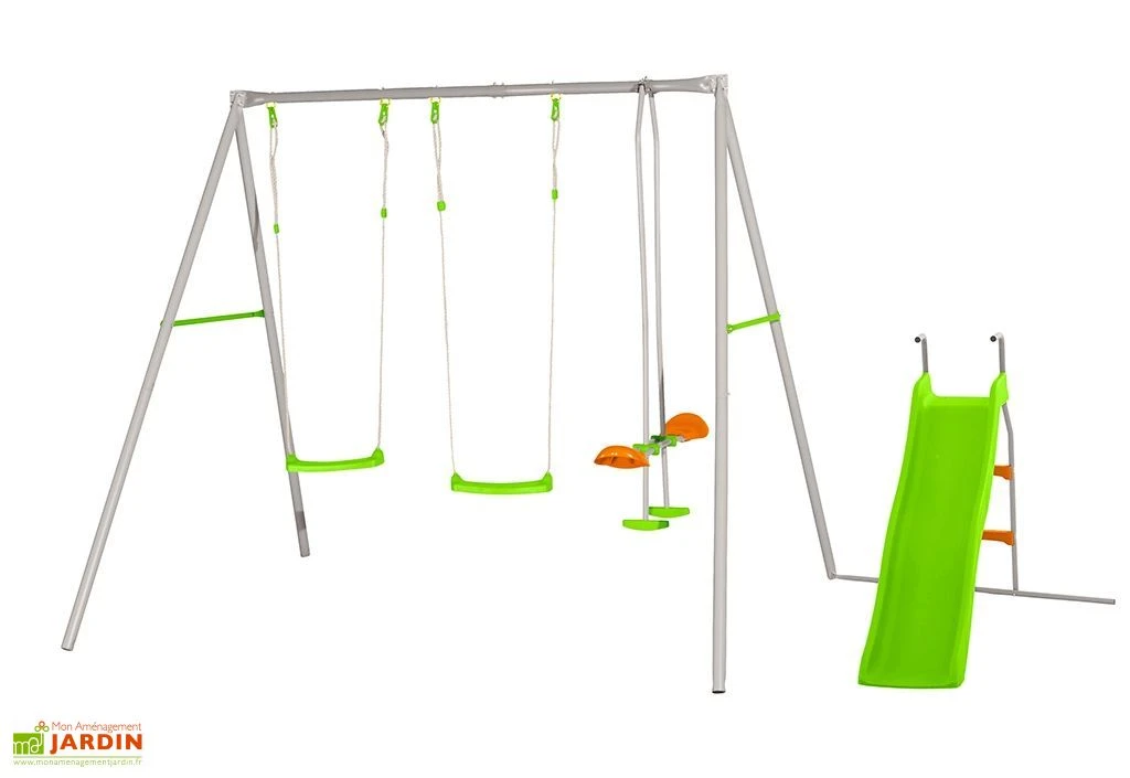 Le portique en métal Raphael de chez Trigano dispose de 4 agrès : 2 balançoires, d’un face-à-face et d’un toboggan, pour accueillir jusqu’à 5 enfants de 3 à 12 ans. Il dispose d’une poutre et de pieds en métal de 5 cm de diamètre et d’entretoises de liaison pour plus de stabilité.