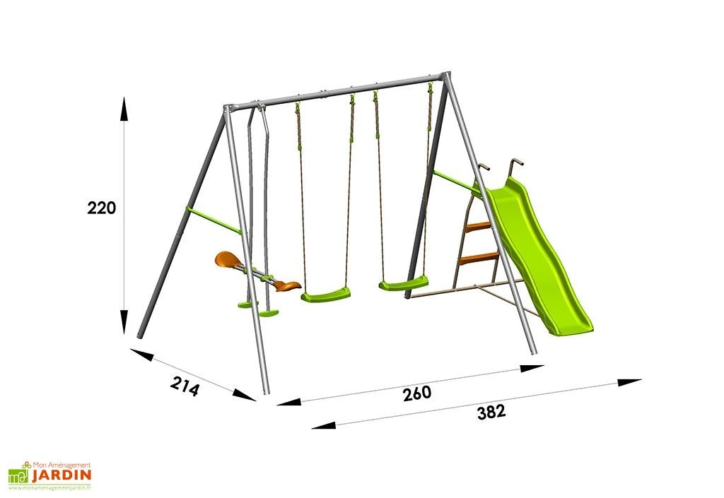 Le portique gris et vert mesure 2,14 m de longueur, 3,82 m de largeur et 2,20 m de hauteur. Son toboggan dispose d’une glissière de 1,73 m de longueur et d’échelons anti-dérapant pour plus de sécurité.