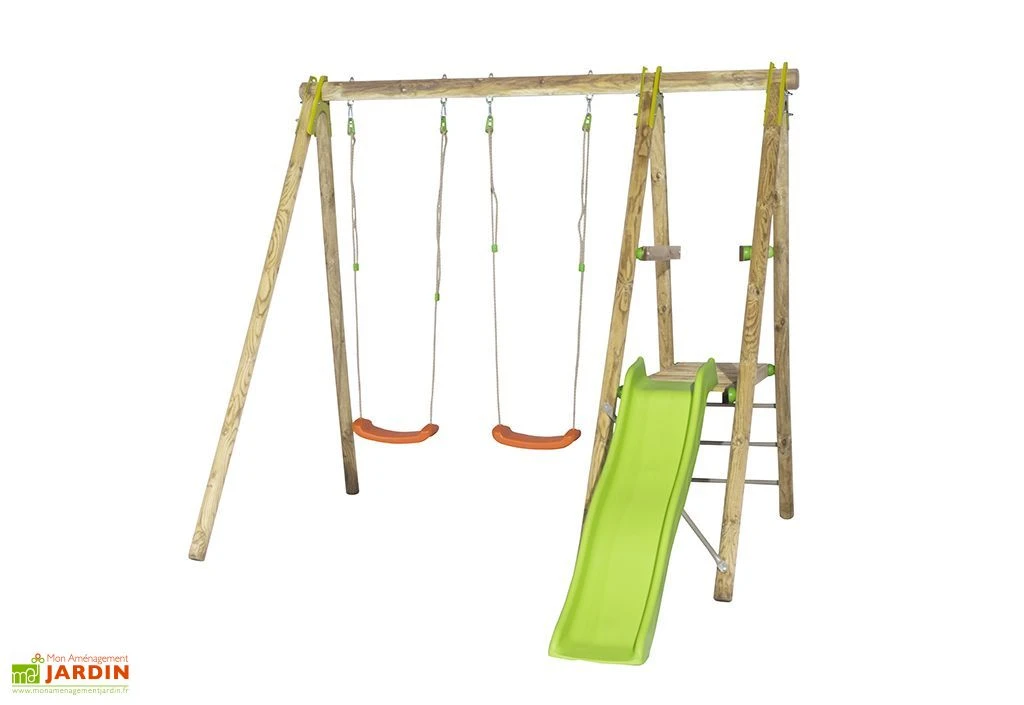 Fabriqué en France, ce portique en bois Trigano mesure 2,30 m de hauteur, est doté de deux balançoires et d’un toboggan de 1,73 m de long. Il est conçu pour accueillir jusqu’à quatre enfants âgés de 3 à 12 ans. Le pin utilisé pour la fabrication de ce portique est traité par autoclave classe 4, ce qui signifie qu’il résistera aux intempéries mais également aux insectes et autres champignons, le tout sans demander un entretien particulier. Facile à installer, ce portique devra être obligatoirement scellé dans le sol.