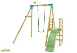 Le portique en bois de chez TP Toys propose de multiples activités pour ravir les enfants de 3 ans minimum. Vous retrouverez ainsi une balançoire ainsi qu’un toboggan et son échelle pour satisfaire tout le monde. Ce portique s’élève sur 2,4 m de hauteur, et mesure 2,49 m de longueur pour 3,78 m de largeur. L’ensemble de la structure pourra supporter une charge maximale de 150 kg au total, et de 60 kg pour la balançoire.