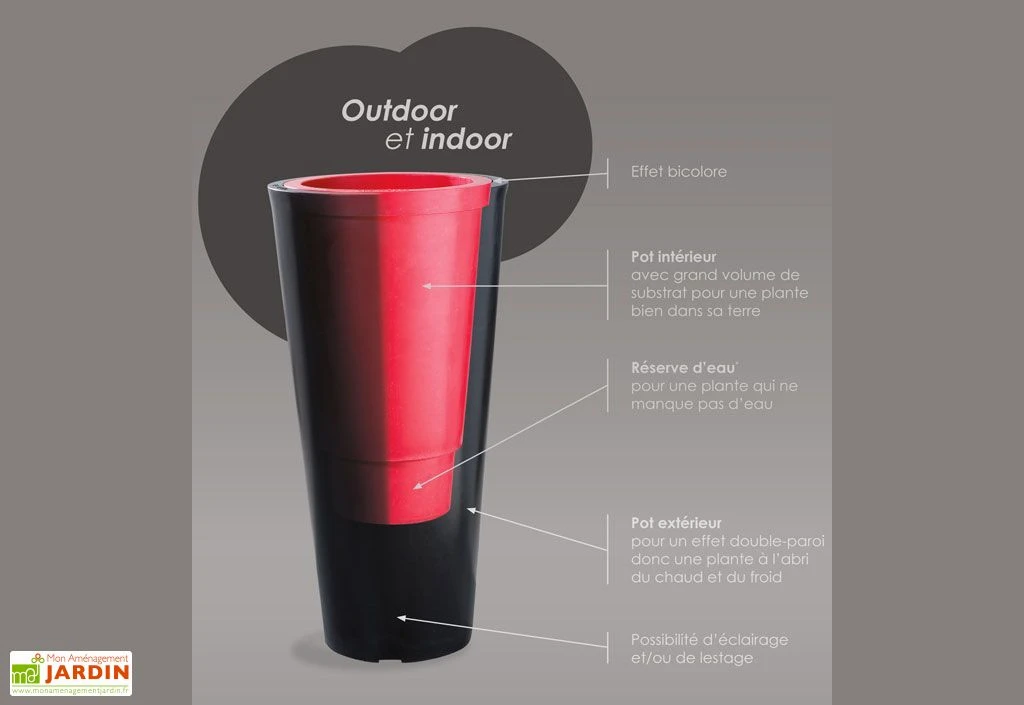 La version double paroi possède plusieurs avantages, notamment en termes de robustesse et d’isolation de vos végétaux. Composé de deux pots, le bac à fleurs possède une réserve d’eau de 4,5 L pour vos plantes. Le plus petit pot dispose également d’un double fond lui permettant de stocker l’eau et de la faire remonter dans le terreau à l’aide d’un système de mèche. Notez que le pot à double paroi pourra accueillir jusqu’à 43 L de terreau.