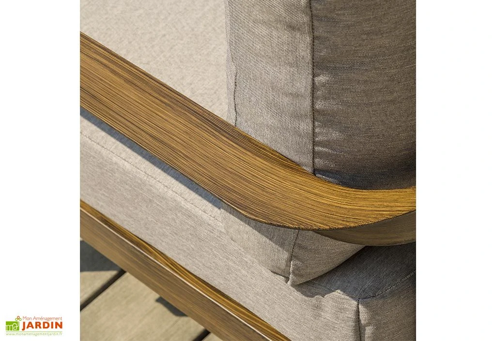 Comme Ă©voquĂ© plus haut, les structures de la banquette, des fauteuils et de la table basse sont conçues en aluminium. Cet alliage possède de nombreux avantages, dont celui d’être insensible Ă la rouille, et ce sans entretien ou traitement particulier. Il s’agit Ă©galement d’un matĂ©riau plutĂ´t lĂ©ger. Vous pourrez donc dĂ©placer facilement les diffĂ©rents Ă©lĂ©ments qui composent ce salon de jardin bas.Â