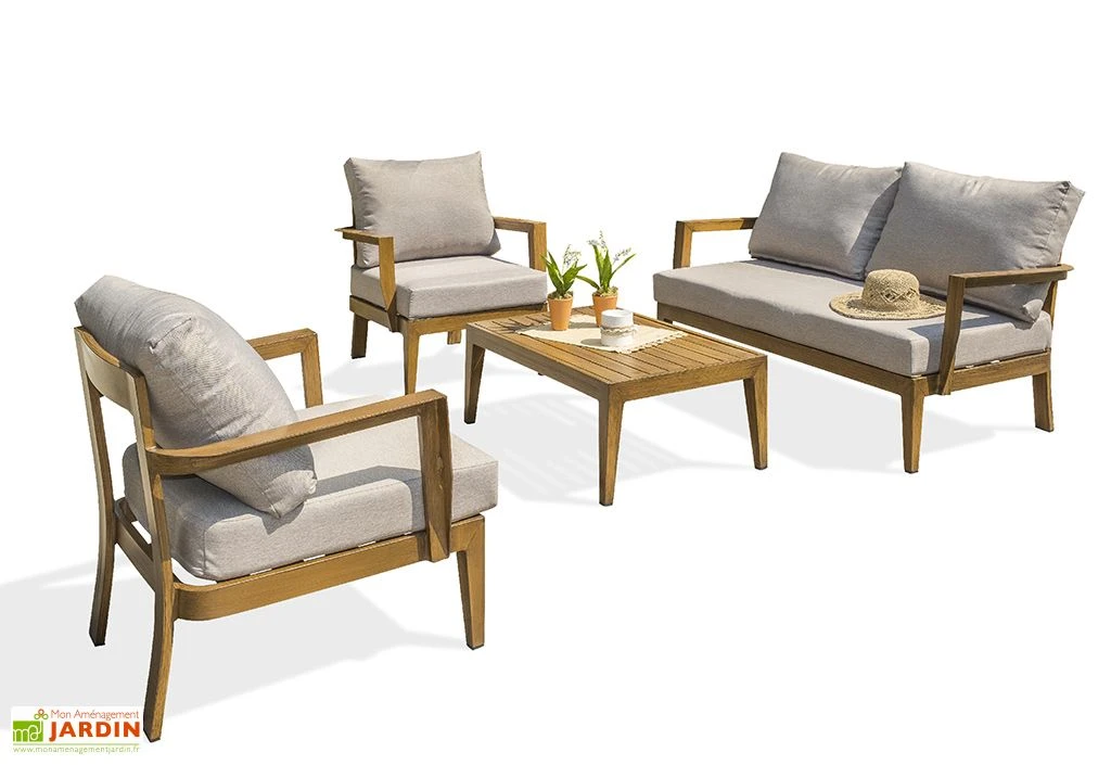 Le salon de jardin Portofino de chez DCB Garden mĂŞle la beautĂ© du bois Ă la rĂ©sistance de l’aluminium. Sa finition imitation bois lui confère en effet un look chic et Ă©lĂ©gant auquel contribuent les coussins de couleur grise Ă©galement inclus. Ces derniers, Ă©pais de 12 cm, sont dĂ©houssables et vous offriront des conditions d’assise tout Ă fait confortables.Â