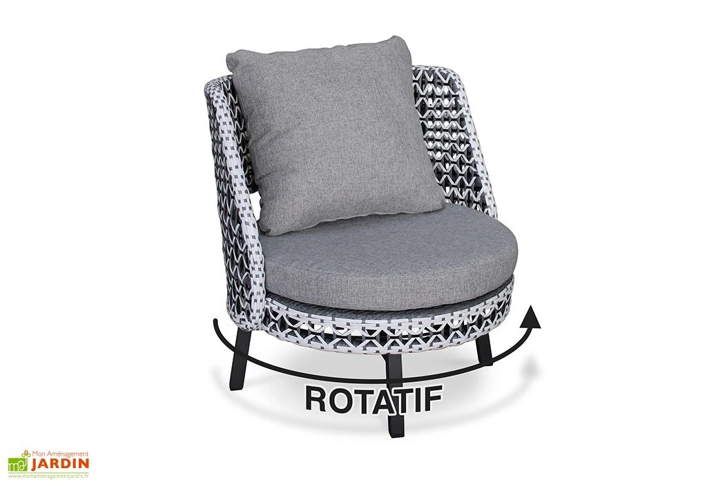 Le salon de jardin Agadir de la marque DCB Garden est composé d’un canapé de deux places, de deux fauteuils à assise rotative et de deux petites tables basses rondes (plateau en verre trempé de 8 mm d’épaisseur). Il pourra donc accueillir quatre personnes dans de bonnes conditions, le temps d’un moment de détente en famille ou entre amis.
