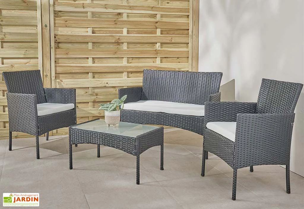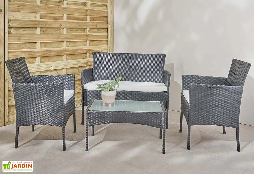 Le salon de jardin Barcelone de chez Wilsa est parfait pour profiter de moments de détente en extérieur, en famille ou entre amis ! Il offre quatre places confortables et se compose de deux fauteuils de jardin, d’un canapé deux places et d’une table basse rectangulaire avec plateau en verre de 5 mm d’épaisseur que vous pourrez choisir en noir, gris ou finition marron.